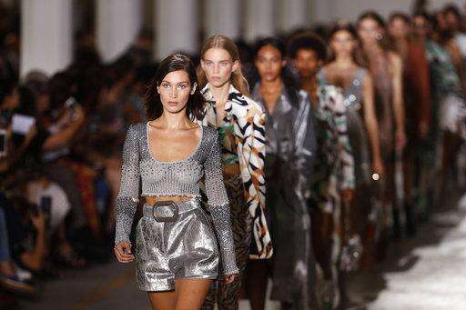Model Bella Hadid leads other models as part of the Cavalli women's 2019 Spring-Summer collection, unveiled during the Fashion Week in Milan, Italy, Saturday, Sept. 22, 2018. (AP Photo/Antonio Calanni)