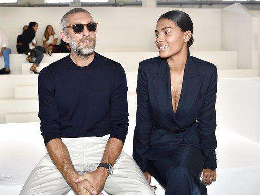 Actor Vincent Cassel and his wife Tina Kunakey attend the Roberto Cavalli women's 2019 Spring-Summer collection, unveiled during the Fashion Week in Milan, Italy, Saturday, Sept. 22, 2018. (Flavio Lo Scalzo/ANSA via AP)