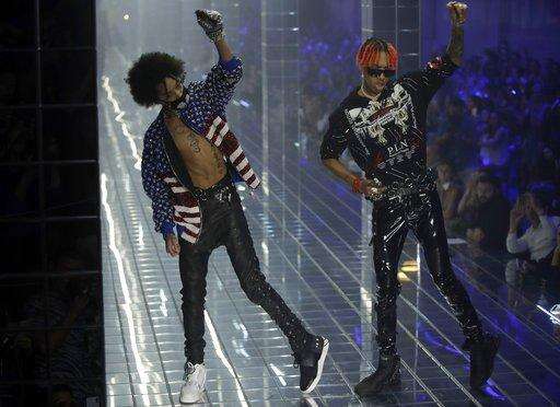 Dancers Ayo and Two perform during Philipp Plein's women's 2019 Spring-Summer collection, unveiled during the Fashion Week in Milan, Italy, Friday, Sept. 21, 2018. (AP Photo/Luca Bruno)