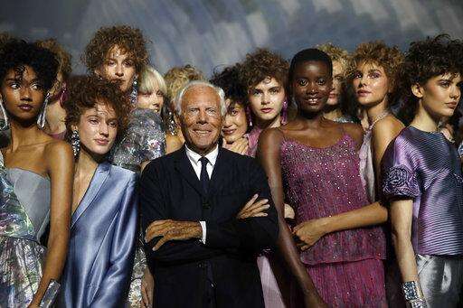 Designer Giorgio Armani, centre, poses with models at the end of his women's 2019 Spring-Summer collection, unveiled during the Fashion Week in Milan, Italy, Sunday, Sept. 23, 2018. (AP Photo/Luca Bruno) The Associated Press