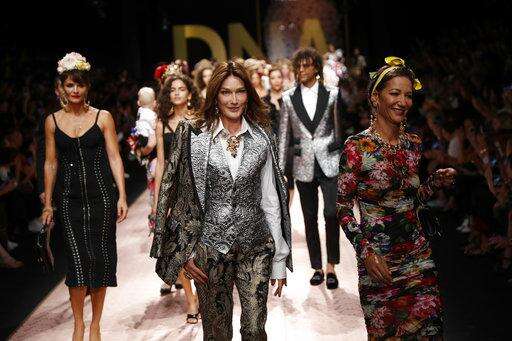 Model Carla Bruni Sarkozy, centre, walks with other models as they wear creations as part of the Dolce & Gabbana women's 2019 Spring-Summer collection, unveiled during the Fashion Week in Milan, Italy, Sunday, Sept. 23, 2018. (AP Photo/Antonio Calanni) The Associated Press