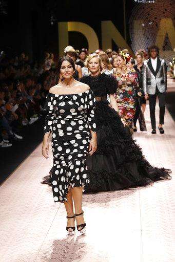 Model Monica Bellucci leads other models as they wear creations as part of the Dolce & Gabbana women's 2019 Spring-Summer collection, unveiled during the Fashion Week in Milan, Italy, Sunday, Sept. 23, 2018. (AP Photo/Antonio Calanni) The Associated Press