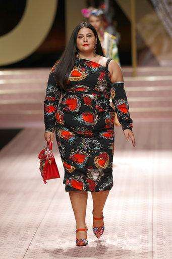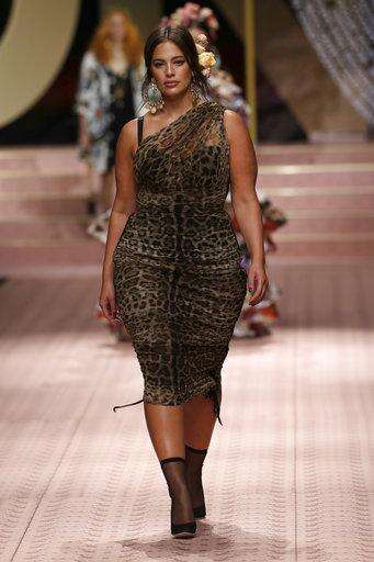Model Ashley Graham wears a creation as part of the Dolce & Gabbana women's 2019 Spring-Summer collection, unveiled during the Fashion Week in Milan, Italy, Sunday, Sept. 23, 2018. (AP Photo/Antonio Calanni) The Associated Press