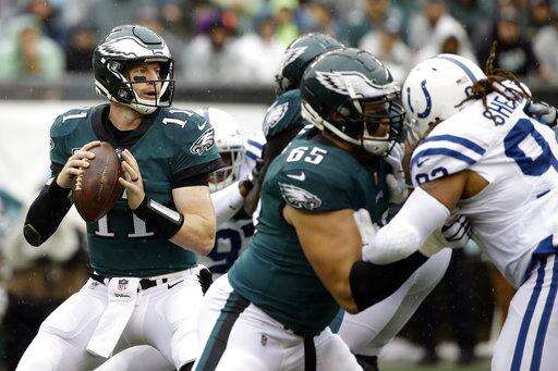 Wentz played for the first time since he tore his ACL and LCL in Week 14 diving into the end zone on a scramble. He wore a brace on his left knee on a soggy day in Philadelphia.