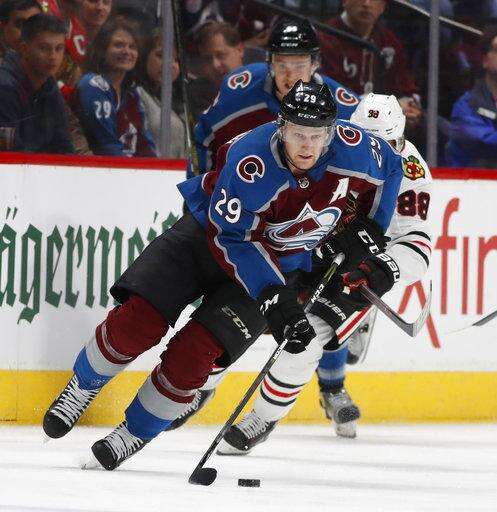 In this Friday, March 30, 2018, file photograph, Colorado Avalanche center Nathan MacKinnon drives down the ice with the puck against the Chicago Blackhawks in the first period of an NHL hockey game in Denver. (AP Photo/David Zalubowski, File) The Associated Press