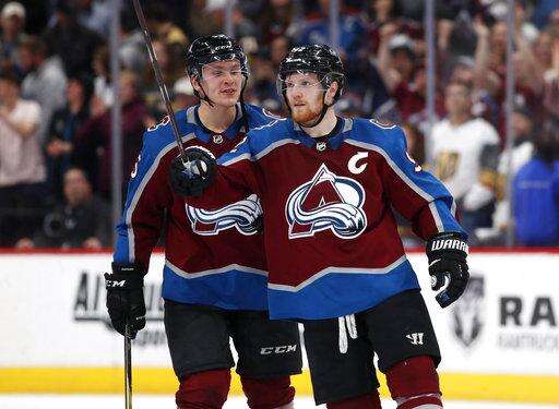FILE - In this Saturday, March 24, 2018, file photograph, Colorado Avalanche right wing Mikko Rantanen, left, celebrates with left wing Gabriel Landeskog after he scored the winning goal against the Vegas Golden Knights in the shootout session of an NHL hockey game in Denver. (AP Photo/David Zalubowski, File) The Associated Press