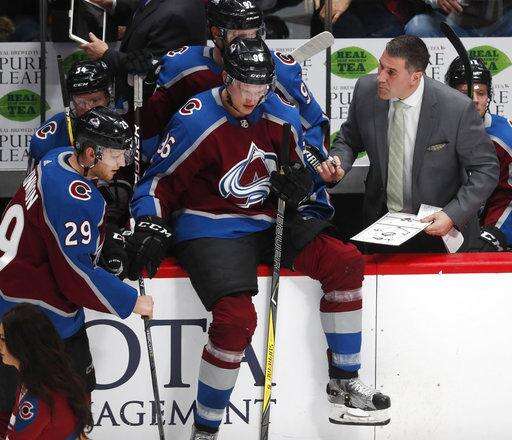 FILE - in this Wednesday, March 28, 2018, file photograph, Colorado Avalanche head coach Jared Bednar, right, confers with right wing Mikko Rantanen, center, and center Nathan MacKinnon after drawing up a play during a time out against the Philadelphia Flyers in the third period of an NHL hockey game in Denver. (AP Photo/David Zalubowski, File) The Associated Press