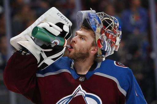FILE - In this Saturday, March 24, 2018, file photograph, Colorado Avalanche goalie Semyon Varlamov takes a drink during a time out against the Vegas Golden Knights in an NHL hockey game in Denver. (AP Photo/David Zalubowski, File) The Associated Press