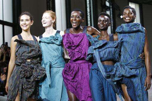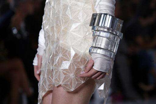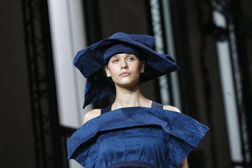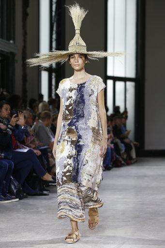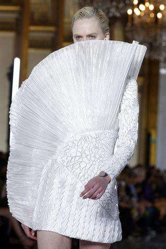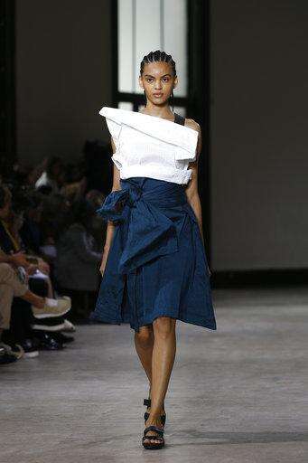 The 31-piece collection began underwhelmingly with a series of gowns reminiscent of tie-dye. But then swathes of billowing fabric in celestial blue and white were used to form tops and skirts with beautifully abstract silhouettes.