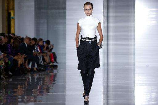 Delevingne opened the show in a white peaked-shoulder coat and metallic black bustier, lip-synching Prince's "When Doves Cry" all the way down the runway.