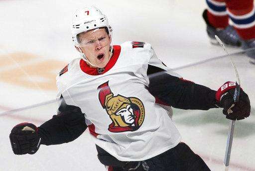 FILE - In this Sept. 22, 2018, file photo, Ottawa Senators' Brady Tkachuk celebrates after scoring against the Montreal Canadiens during the first period of an NHL hockey preseason game, in Montreal. The buzz around the NHL for months has been about smooth-skating Rasmus Dahlin in Buffalo. But other players to watch this season include Ryan Donato in Boston, Brady Tkachuk in Ottawa, Erik Karlsson with his new teammates in San Jose and Ilya Kovalchuk returning to the NHL in Los Angeles. (Graham Hughes/The Canadian Press via AP, File) The Associated Press
