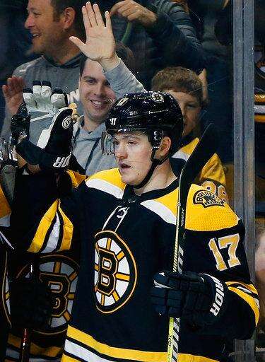 FILE - In this March 31, 2018, file photo, Boston Bruins' Ryan Donato (17) celebrates his goal during the second period of an NHL hockey game against the Florida Panthers, in Boston. The buzz around the NHL for months has been about smooth-skating Rasmus Dahlin in Buffalo. But other players to watch this season include Ryan Donato in Boston, Brady Tkachuk in Ottawa, Erik Karlsson with his new teammates in San Jose and Ilya Kovalchuk returning to the NHL in Los Angeles. (AP Photo/Michael Dwyer, File) The Associated Press