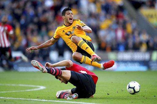 Southampton's Wesley Hoedt, below, and Wolverhampton Wanderers' Raul Jimenez clash during their English Premier League soccer match at Molineux stadium in Wolverhampton, England, Saturday Sept. 29, 2018. (Nick Potts/PA via AP) The Associated Press