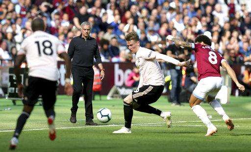 Manchester United manager Jose Mourinho watches the players during the English Premier League soccer match between West Ham United and Manchester United at London Stadium in London in London, England, Saturday, Sept. 29, 2018. (AP Photo/Tim Ireland) The Associated Press