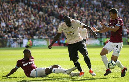 West Ham's Issa Diop, left, and West Ham's Fabian Balbuena, right, challenge Manchester United's Romelu Lukaku, center, during the English Premier League soccer match between West Ham United and Manchester United at London Stadium in London in London, England, Saturday, Sept. 29, 2018. (AP Photo/Tim Ireland) The Associated Press