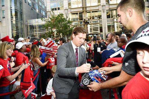 Washington Capitals' Nicklas Backstrom, of Sweden, signs for fans as he walks the red carpet before their opening season NHL hockey game against the Boston Bruins, Wednesday, Oct. 3, 2018, in Washington. (AP Photo/Nick Wass) The Associated Press