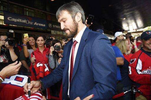 Washington Capitals' Alex Ovechkin, center, of Russia, signs for fans as he walks the red carpet before their opening season NHL hockey game against the Boston Bruins, Wednesday, Oct. 3, 2018, in Washington. (AP Photo/Nick Wass) The Associated Press