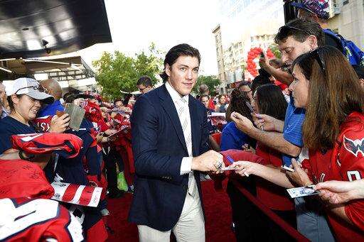 Washington Capitals' T.J. Oshie signs for fans as he walks the red carpet before their opening season NHL hockey game against the Boston Bruins, Wednesday, Oct. 3, 2018, in Washington. (AP Photo/Nick Wass) The Associated Press