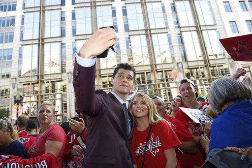 Washington Capitals' Andre Burakovsky, left, takes a selfie with a fan as he walks the red carpet before their opening season NHL hockey game against the Boston Bruins, Wednesday, Oct. 3, 2018, in Washington. (AP Photo/Nick Wass) The Associated Press