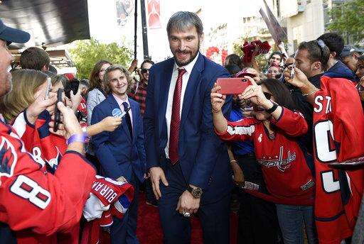Washington Capitals' Alex Ovechkin, center, of Russia, walks the red carpet before their opening season NHL hockey game against the Boston Bruins, Wednesday, Oct. 3, 2018, in Washington. (AP Photo/Nick Wass) The Associated Press