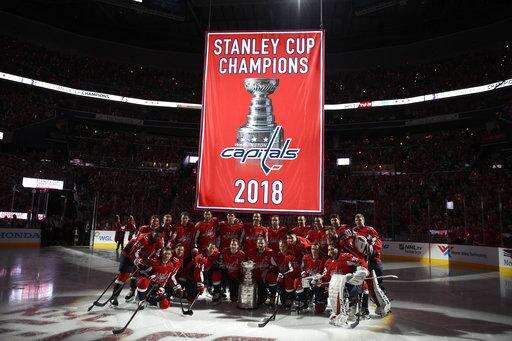 The Washington Capitals pose under the Stanley Cup champions banner before the team's NHL hockey game against the Boston Bruins, Wednesday, Oct. 3, 2018, in Washington. (AP Photo/Nick Wass) The Associated Press