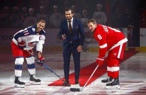 Detroit Red Wings' Henrik Zetterberg, center, drops a ceremonial puck between Columbus Blue Jackets' Nick Foligno (71) and Red Wings' Justin Abdelkader (8) before an NHL hockey game Thursday, Oct. 4, 2018, in Detroit. (AP Photo/Paul Sancya) The Associated Press