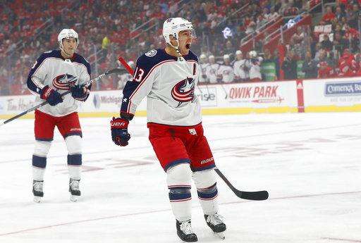 Columbus Blue Jackets' Cam Atkinson (13) celebrates his goal against the Detroit Red Wings during the first period of an NHL hockey game Thursday, Oct. 4, 2018, in Detroit. (AP Photo/Paul Sancya) The Associated Press