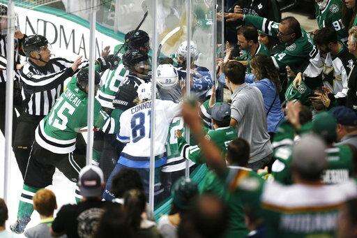 The first period ended with 14 minutes of penalties in the final second. At 19:59, the Methot went off for holding and Winnipeg's Dustin Byfuglien retaliated with a cross checking penalty. On the ensuing faceoff, Brett Ritchie of Dallas and Lowry dropped their gloves and drew fighting majors at 20:00.