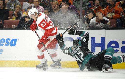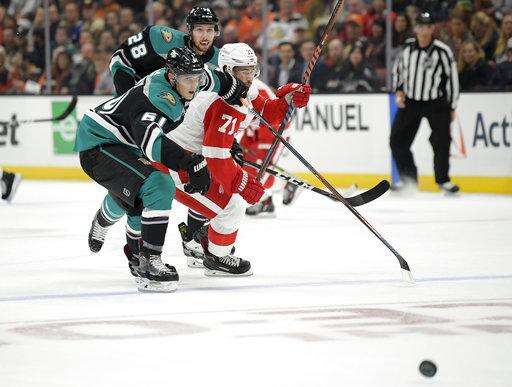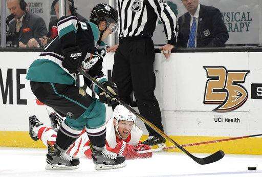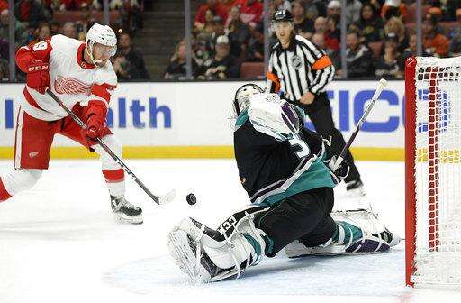 NOTES: Isac Lundestrom, an 18-year-old Swedish center, made his NHL debut for the Ducks. He is the third-youngest player and youngest forward to make his debut with Anaheim. ... D Joe Hicketts returned to the Red Wings' lineup after Trevor Daley injured himself in Los Angeles on Sunday night. ... The healthy Ducks wore the team's 1993 eggplant-and-jade jerseys during pregame warmups, and they played in their new third jerseys using similar colors and the club's original logo with a duck-bill goalie mask and crossed hockey sticks.