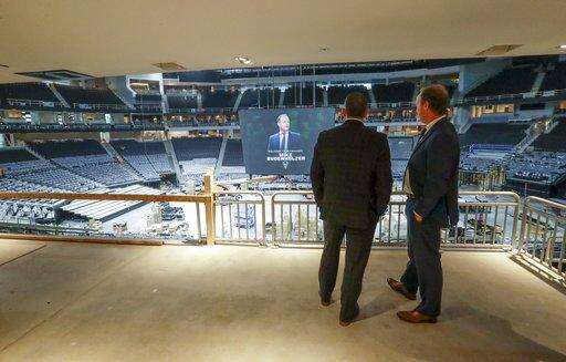 FILE - In this May 21, 2018, file photo, Milwaukee Bucks new head coach Mike Budenholzer talks to general manager Jon Horst after a news conference in the team's new arena, in Milwaukee. (AP Photo/Morry Gash, File) The Associated Press