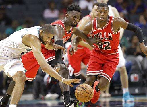 Charlotte Hornets' Nicolas Batum, left, battles Chicago Bulls' Cameron Payne, right, and Bobby Portis, center, for a loose ball in the first half of a preseason NBA basketball game in Charlotte, N.C., Monday, Oct. 8, 2018. (AP Photo/Chuck Burton) The Associated Press