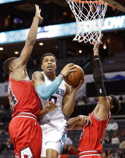 Charlotte Hornets' Miles Bridges (0) drives between Chicago Bulls' Wendell Carter Jr. (34) and Chandler Hutchison (15) in the second half of a preseason NBA basketball game in Charlotte, N.C., Monday, Oct. 8, 2018. (AP Photo/Chuck Burton) The Associated Press