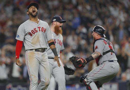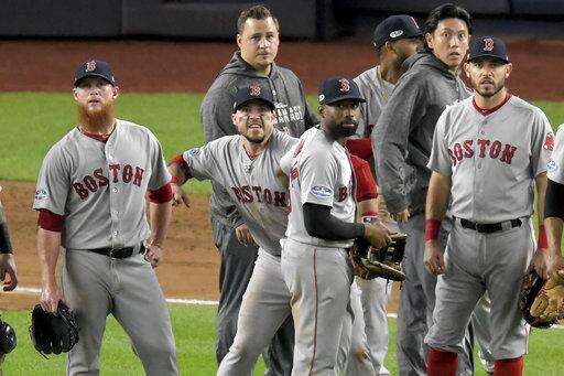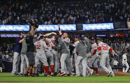 The Boston Red Sox celebrate after beating the New York Yankees 4-3 in Game 4 of baseball's American League Division Series, Tuesday, Oct. 9, 2018, in New York. (AP Photo/Julie Jacobson) The Associated Press