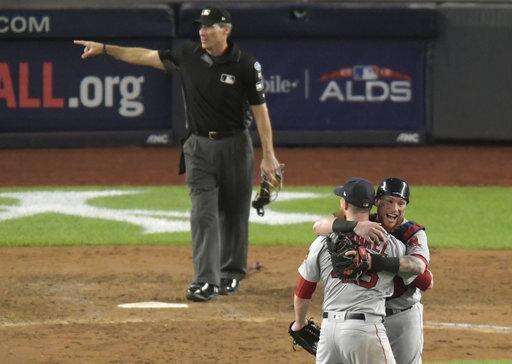 Boston Red Sox catcher Christian Vazquez, right, celebrates with relief pitcher Craig Kimbrel (46) as home plate umpire Angel Hernandez motions that the final play of the game had been challenged by the New York Yankees during the ninth inning of Game 4 of baseball's American League Division Series, Tuesday, Oct. 9, 2018, in New York. The ruling on the field was upheld and the Red Sox won 4-3. (AP Photo/Bill Kostroun) The Associated Press