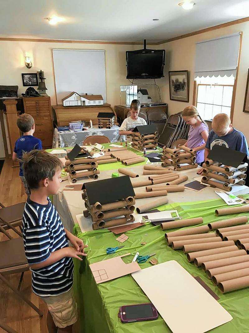 Science of History participants construct cabins out of paper towel tube "Lincoln Logs." Courtesy of Mount Prospect Historical Society
