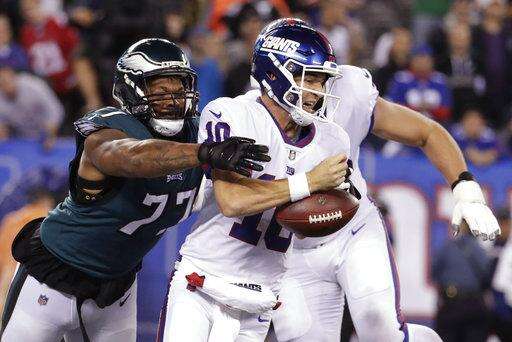 Later in the quarter, Manning was sacked at his 1 and the Giants were forced to punt. The Eagles took advantage of the favorable field position and drove for another touchdown and a 14-3.