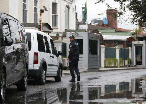 A Turkish police officer walks outside the Saudi Arabia consul general residence in Istanbul, Thursday, Oct. 18, 2018. Turkish crime-scene investigators finished an overnight search of both residence and a second search of the consulate itself amid Ankara's fears that Saudi writer Jamal Khashoggi was killed and dismembered inside the diplomatic mission in Istanbul. (AP Photo/Lefteris Pitarakis) The Associated Press