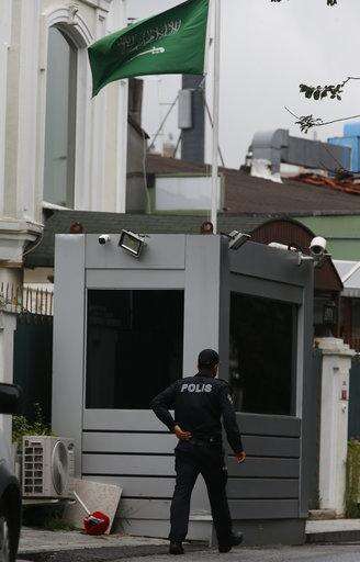 A security guard stands at the entrance of Saudi Arabia consulate in Istanbul, Thursday, Oct. 18, 2018. Turkish crime-scene investigators finished an overnight search of both the consul general's residence and a second search of the consulate itself amid Ankara's fears that Saudi writer Jamal Khashoggi was killed and dismembered inside the diplomatic mission in Istanbul. (AP Photo/Lefteris Pitarakis) The Associated Press