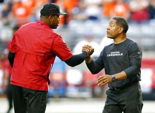 Arizona Cardinals quarterback coach Byron Leftwich, left, greets head coach Steve WIlks prior to an NFL football game against the Denver Broncos, Thursday, Oct. 18, 2018, in Glendale, Ariz. The Cardinals announced Friday, Oct. 19, 2018, that offensive coordinator Mike McCoy has been relieved of his duties and that Byron Leftwich will assume his position. (AP Photo/Ralph Freso) The Associated Press