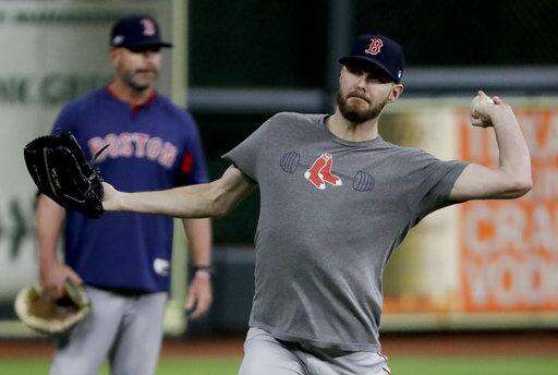 Boston Red Sox starting pitcher Chris Sale warms up during batting practice before Game 4 of a baseball American League Championship Series against the Houston Astros on Wednesday, Oct. 17, 2018, in Houston. (AP Photo/Frank Franklin II) The Associated Press