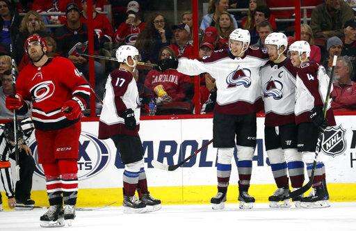 Colorado Avalanche's Gabriel Landeskog (92), of Sweden, celebrates his goal with Tyson Jost (17), Mikko Rantanen (96), of Finland and Tyson Barrie (4) during the second period of an NHL hockey game in Raleigh, N.C., Saturday, Oct. 20, 2018. The Carolina Hurricanes' Jordan Martinook (48) skates away. (AP Photo/Chris Seward) The Associated Press