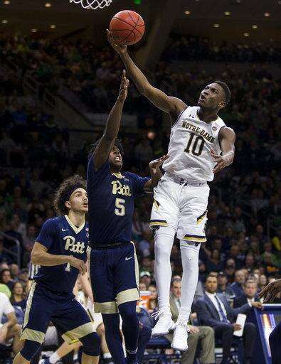 FILE - In this Feb. 28, 2018, file photo, Notre Dame's T.J. Gibbs (10) goes up for a shot over Pittsburgh's Marcus Carr (5) and Parker Stewart (1) during the second half of an NCAA college basketball game, in South Bend, Ind. Notre Dame's season opener is Nov. 6 against Illinois-Chicago in the Gotham Classic at the Purcell Pavilion. (AP Photo/Robert Franklin, File) The Associated Press
