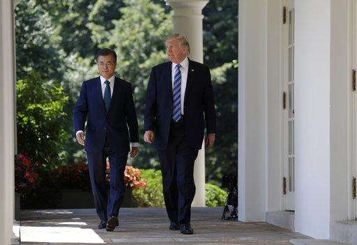 FILE - In this June 30, 2017 file photo, President Donald Trump walks with South Korean President Moon Jae-in to make statements in the Rose Garden of the White House in Washington. Trump has shaken up Asia, as he has much of the world. Now Beijing, Seoul and other Asian capitals are waiting to see if the Democrats wrest control of at least one house of Congress from the Republicans - and whether that would significantly alter U.S. foreign policy and trade initiatives. In South Korea, the concern is that Trump might sour on North Korea after months of bold engagement. (AP Photo/Evan Vucci, File) The Associated Press