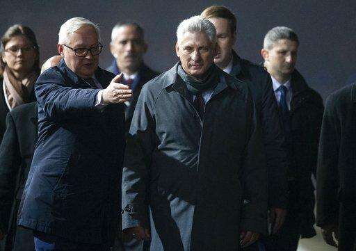 Russian Deputy Foreign Minister Sergei Ryabkov, left, welcomes Cuba's President Miguel Diaz-Canel, upon his arrival at Moscow's Government Vnukovo airport for an official visit to Russia, Russia, Thursday, Nov. 1, 2018. Diaz-Canel is set to hold talks with Russian President Vladimir Putin on steps to expand cooperation between the two nations. (AP Photo/Alexander Zemlianichenko) The Associated Press