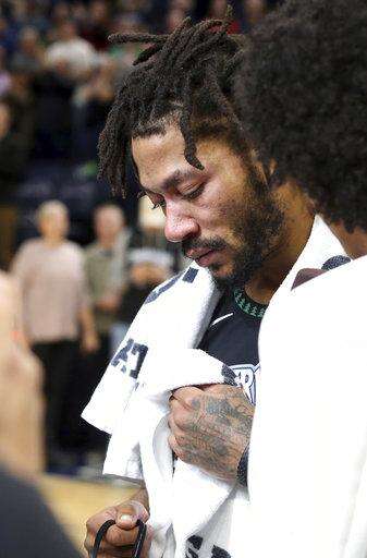 Minnesota Timberwolves' Derrick Rose composes himself before a television interview after he scored 50 points, a career high, against the Utah Jazz in an NBA basketball game Wednesday, Oct. 31, 2018, in Minneapolis. The Timberwolves won 128-125. (AP Photo/Jim Mone) The Associated Press
