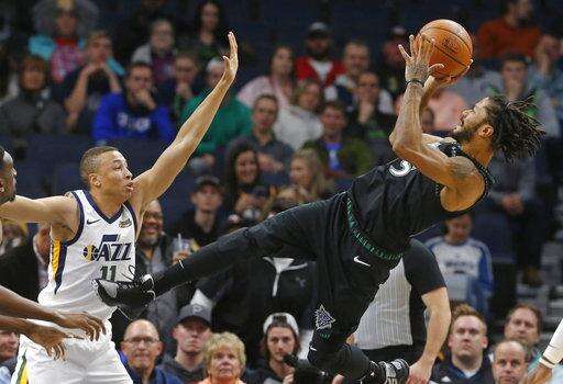 Minnesota Timberwolves' Derrick Rose, right, takes a fall-back shot as Utah Jazz's Dante Exum defends sueinf the first half of an NBA basketball game Wednesday, Oct. 31, 2018, in Minneapolis. (AP Photo/Jim Mone) The Associated Press