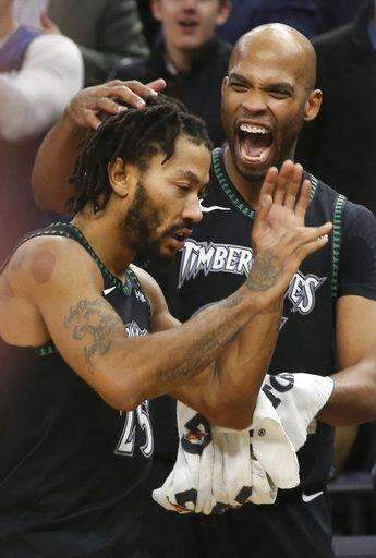 Minnesota Timberwolves' Taj Gibson, right congratulates Derrick Rose after the Timberwolves defeated the Utah Jazz 128-125 in an NBA basketball game Wednesday, Oct. 31, 2018, in Minneapolis. Rose had a career-high 50 points. (AP Photo/Jim Mone) The Associated Press