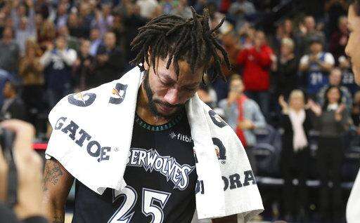 Minnesota Timberwolves' Derrick Rose is interviewed after he scored 50 points, a career high, against the Utah Jazz in an NBA basketball game Wednesday, Oct. 31, 2018, in Minneapolis. The Timberwolves won 128-125. (AP Photo/Jim Mone) The Associated Press