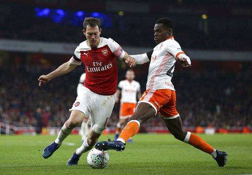 Arsenal's Stephan Lichtsteiner, left, and Blackpool's Mark Bola battle for the ball, during the English League Cup 4th round soccer match between Arsenal and Blackpool, at the emirates Stadium, in London, Wednesday, Oct. 31, 2018. (Nigel French/PA via AP) The Associated Press
