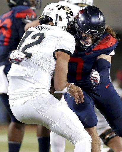 Arizona linebacker Colin Schooler (7) slams into Colorado quarterback Steven Montez (12) for a sack during the second quarter of an NCAA college football game Friday, Nov. 2, 2018, in Tucson, Ariz. (Kelly Presnell/Arizona Daily Star via AP) The Associated Press